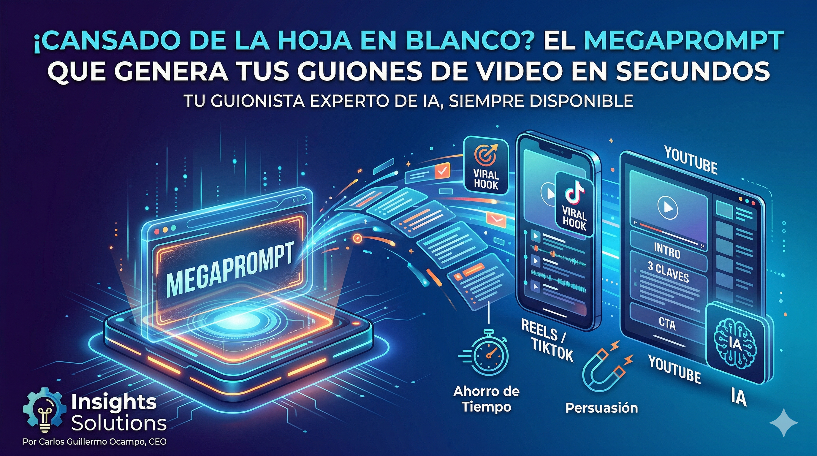 Imagina tener un guionista experto a tu disposición las 24 horas del día, los 7 días de la semana, que entiende perfectamente tu nicho, tu tono de voz y los objetivos de tus videos. Eso es exactamente lo que hace nuestro megaprompt. No es una simple instrucción para ChatGPT; es un sistema completo diseñado por expertos en contenido e IA de Insights Solutions.
